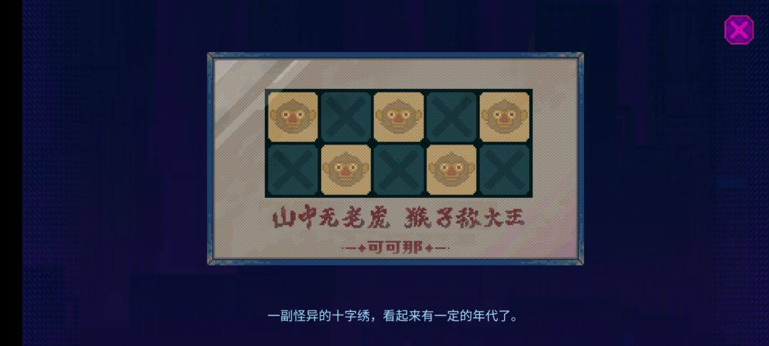 地图右边的十字绣是提示,按照十字绣上叉叉的排列顺序按牙齿,会拿到一瓶酒
