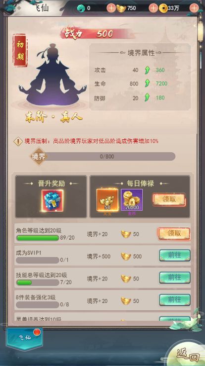 通关第5关后解锁飞仙仙位功能,提升仙位会增加少量属性,但高级仙位将会对低于自己境界的玩家进行压制,PVP时将会提升10%的伤害效果
