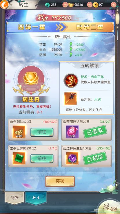 PS:转生等级除了通过任务解锁以外还可使用转生丹直接无视任务进行转生,转生丹只有通过游戏活动获得。