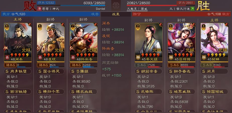 可以看到对手这队45级的队伍,相当地强势,连吃我的满红三势吕、吴骑。