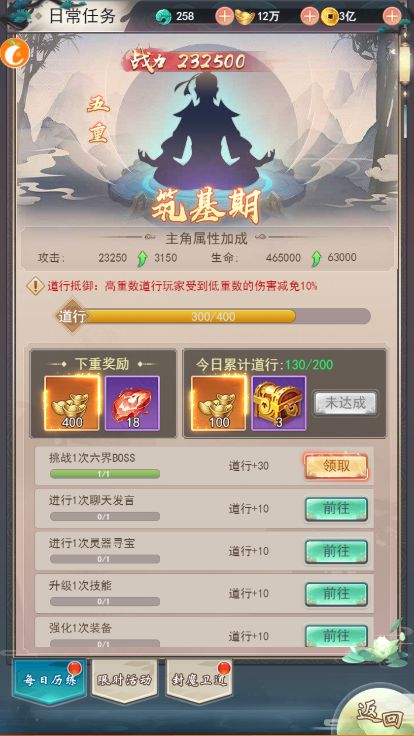 每天获得200点道行后可领取每日奖励,提升道行等阶还有额外海量元宝以及稀有道具奖励。