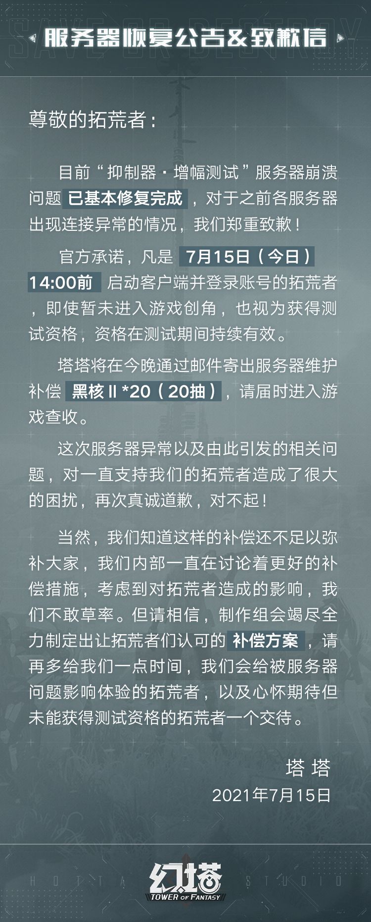 【服务器恢复公告&致歉信】