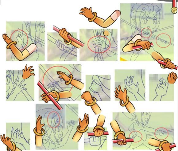 在动作设计完成后,就要根据草图绘制角色的补件啦!由于金丝猴的动作比较多,我们在补件绘制上也比较费心思,光是手的补件就排了几页之多,图中只展示了手部补件的一小部分~