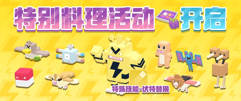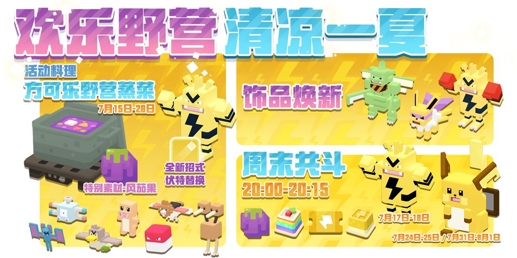 7月15日至8月11日,探险家们通过参与系列活动即可获得特别食材“风茄果”,将它与其他食材投入炖锅后便有机会烹饪出方可乐野营蒸菜,这道菜深受电属性和飞行属性宝可梦的喜爱,包括皮卡丘、霹雳电球、大葱鸭等宝可梦都有可能被吸引至营地加入探险小队,还有概率吸引到携带了特别招式“伏特替换”的电击兽,它的实力一定能带给你巨大的惊喜。