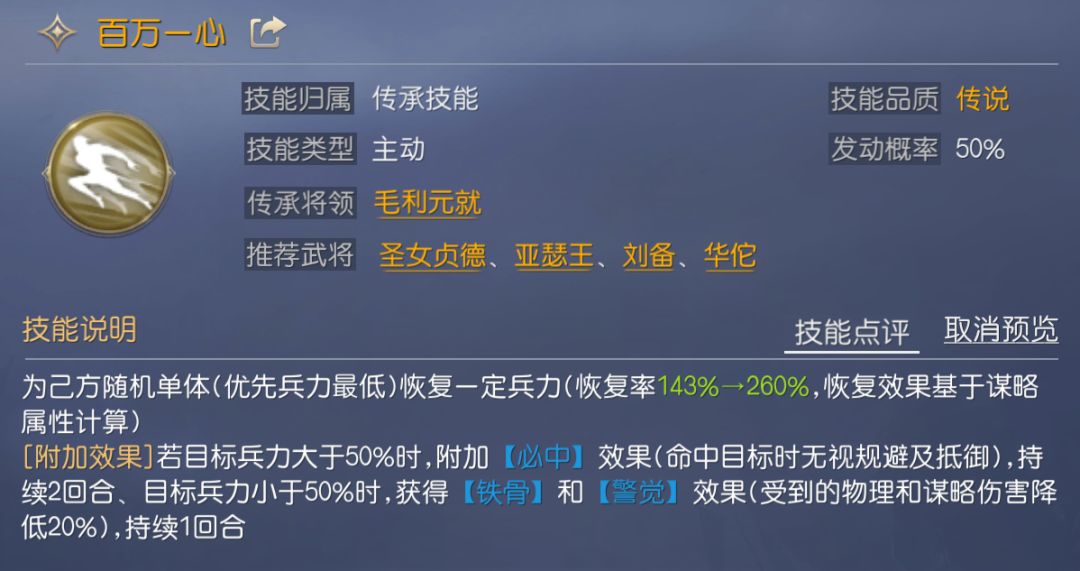 首先利用忠诚护卫让毛利元就分担威灵顿受到的伤害,再搭配上百万一心,利用较高的单体恢复率和危险血线额外减伤的效果,保证毛利元就的兵力健康,尽量减少暴毙的可能性。若是担心毛利元就在前4回合出现重伤情况,也可以将忠诚护卫更换为仰慕华风,只单纯提供伤害增益即可。