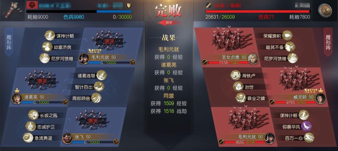 如图中敌方为同样法核阵容,并且也是追求奇谋爆发的单核队伍,我方虽然在初始兵力上有4000的劣势,但仅以400战损就全灭了敌方。这是因为威灵顿的技能发动效率远超其他法核,所以当诸葛亮在第2回合仍未发动诸葛连弩时,基本就宣告了对战结果,这便是奇谋法刀队在同类法核阵容中的巨大优势。