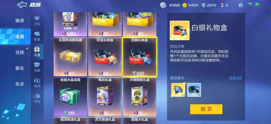 好在白银启动器可以在商城里购买到!根据本糖的计算,花费500酷币购买白银礼物盒,是最快获取启动器的办法。1份礼物盒包含1个白银启动器和1天的黑钻印记。购买160次,共计需要80000酷币。