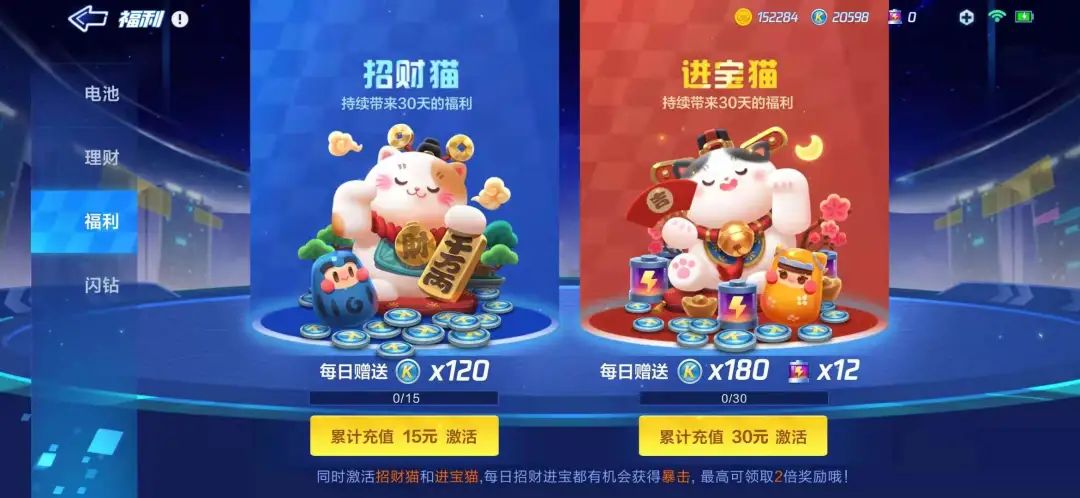 若开通了招财猫,30天内每日可获得120酷币;开通进宝猫则30天内每日可获得180酷币;若两者同时开通,每日还有机会触发暴击,获得两倍奖励。意味着一个月最低可获得9000酷币,最高则是18000酷币!