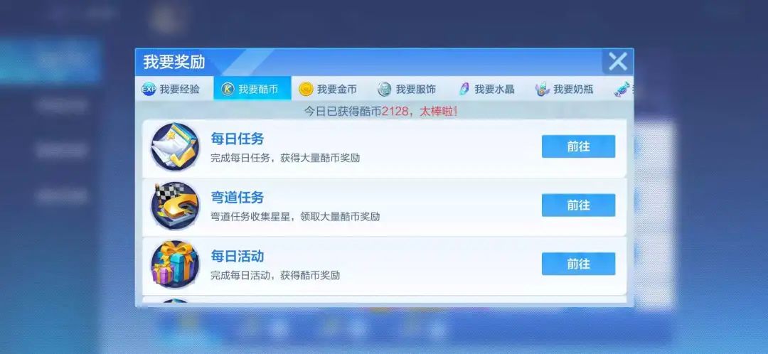 通过完成每日任务,每天都可领取到580酷币,而达到一定活跃度后,每周还可领取三个周活跃礼包,共包含1200酷币。