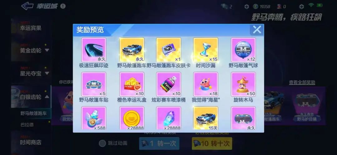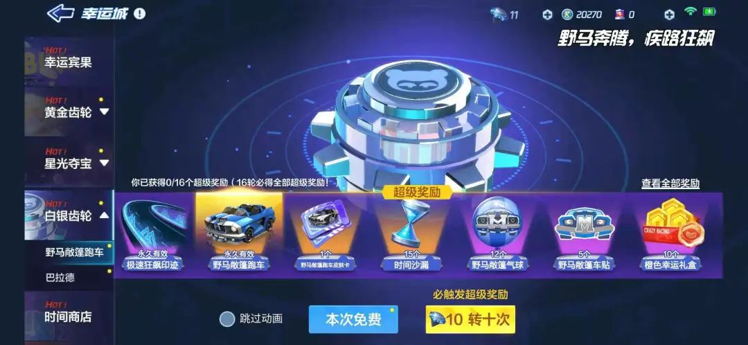 经过本糖的计算,抽取一次白银齿轮需要1个白银启动器,而抽取十次需要10个启动器,且必定获得一份超级奖励。本糖想要的野马敞篷跑车就属于超级奖励。