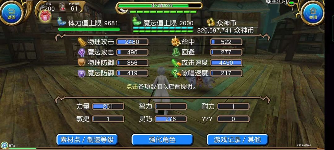 然后我们看一下属性,因为我比较着急,没练满级,2天从1级练到200级赶着写攻略,大家理解一下。