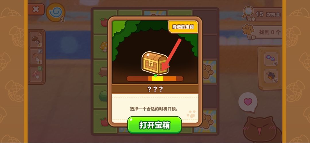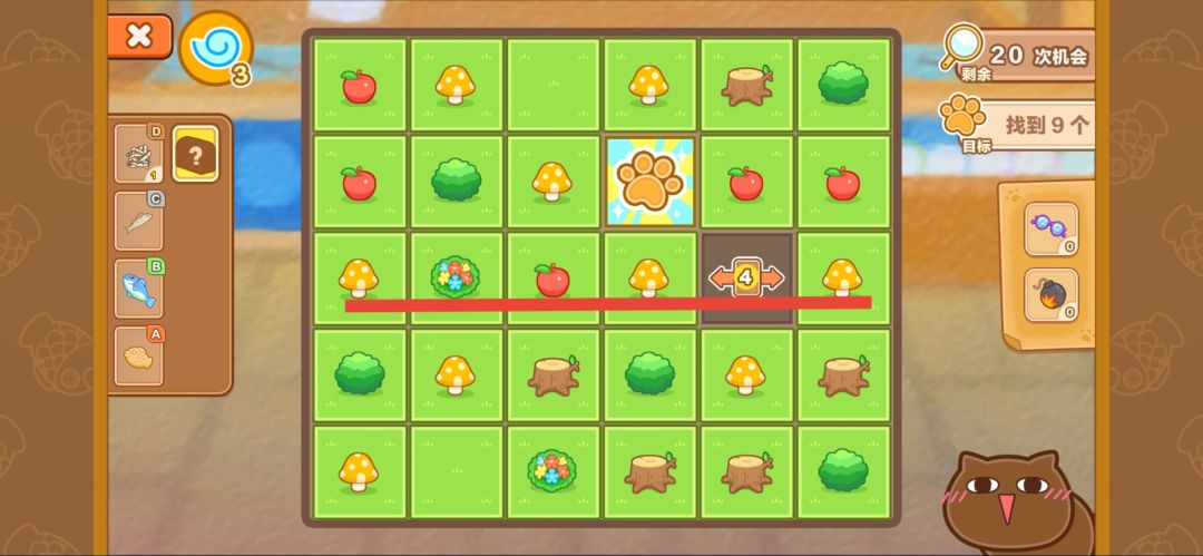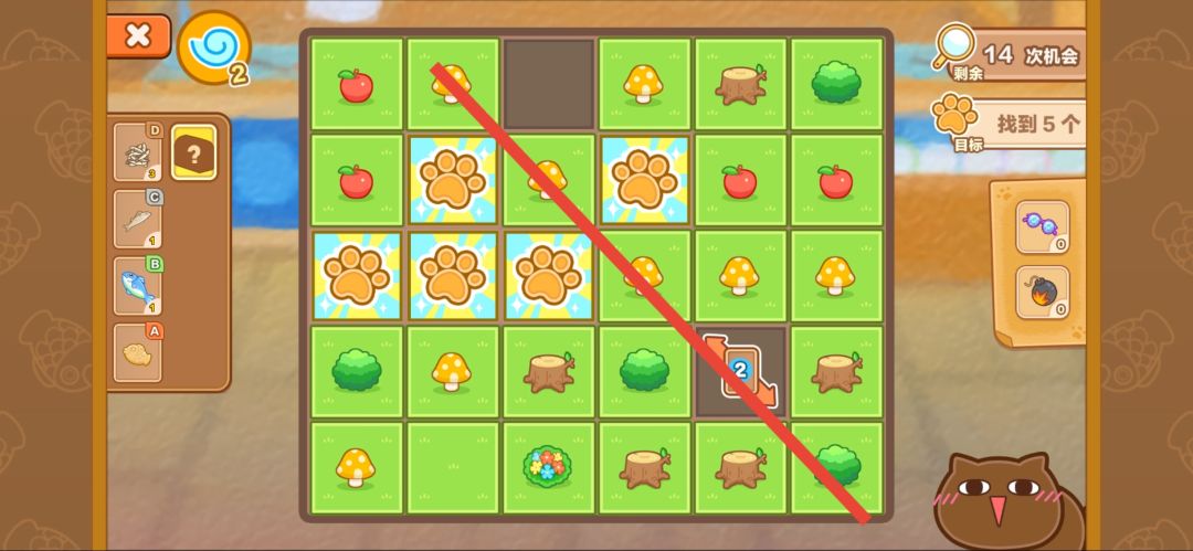 宝箱停在黄色区域可以一次打开,停在橙色区域需要两次打开。当翻牌为下图数字4时,代表一横排中有四个目标(目标地方不确定,只能确定数量)。当翻牌为下图数字2时,代表一个斜排有两个目标。当步数用完时可以看广告增加2个步数,每关限看3次。