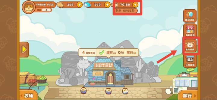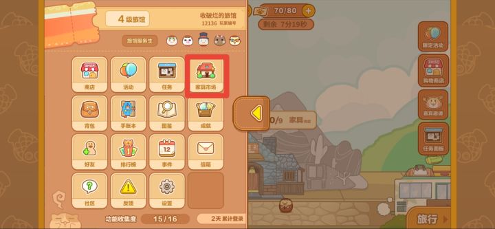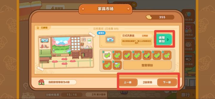 点开左侧黄色箭头,找到家具市场。切换到当前旅馆级别即可调整装扮