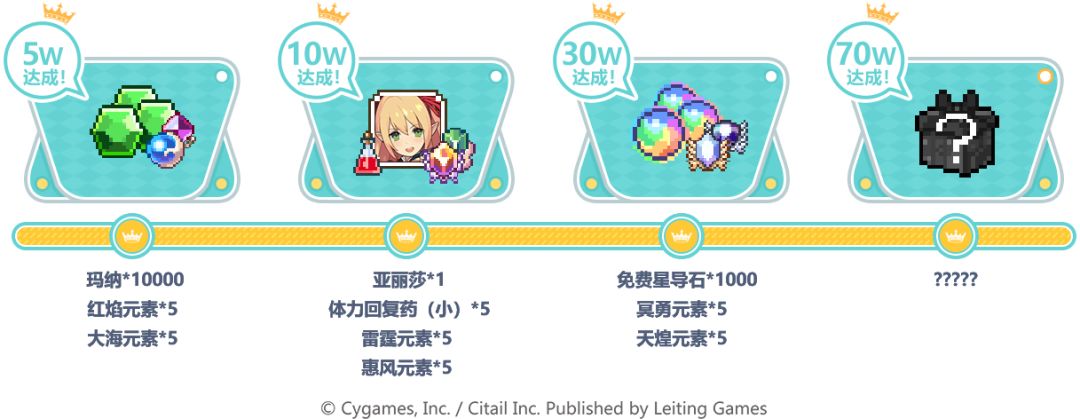 预约人数达10W,可解锁奖励:亚里莎*1、体力回复药(小)*5、雷霆元素*5、惠风元素*5