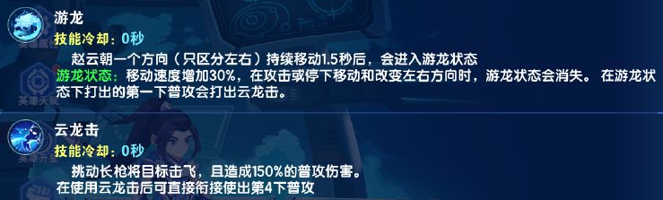赵云持续移动会大大提高移动速度,同时第一次普攻会打出云龙击,可将敌人击飞。击飞敌人后,赵云的技能或普攻都可进行衔接连招。