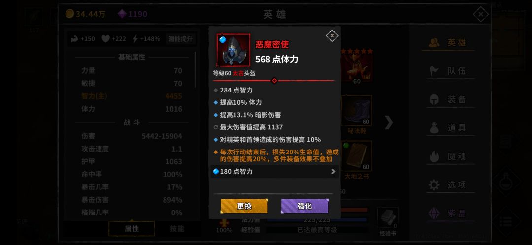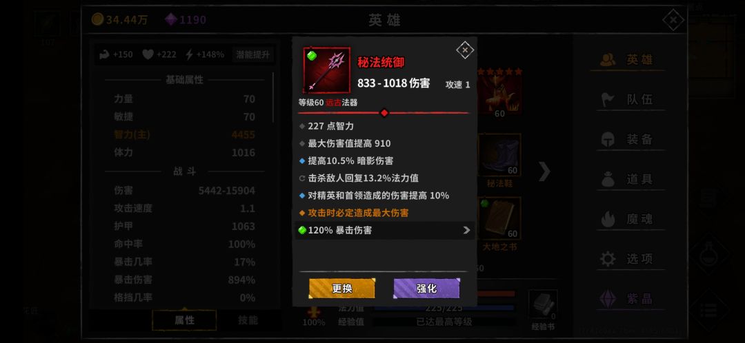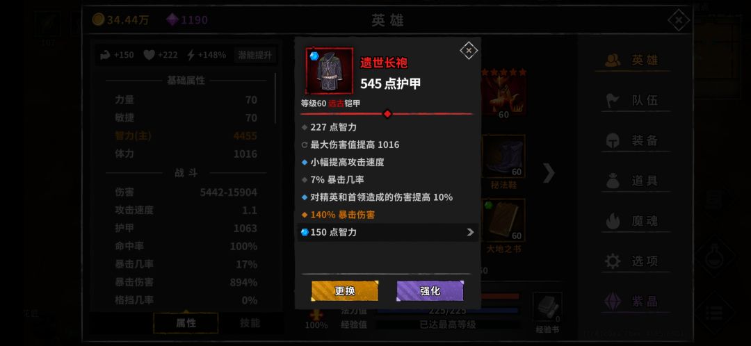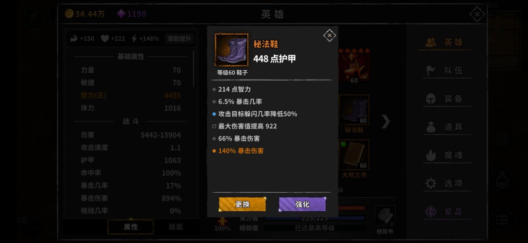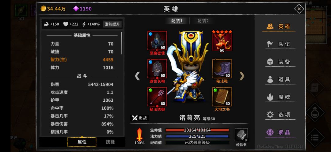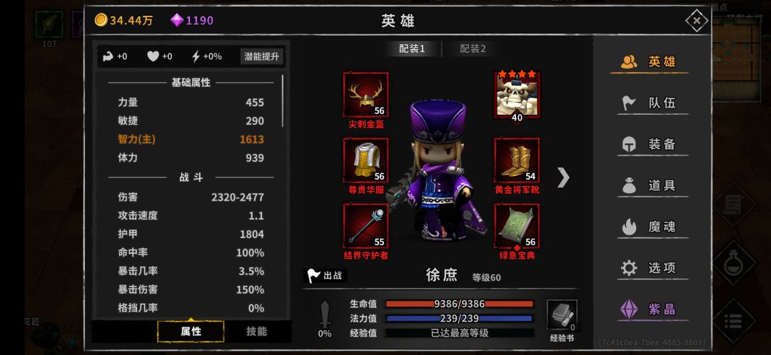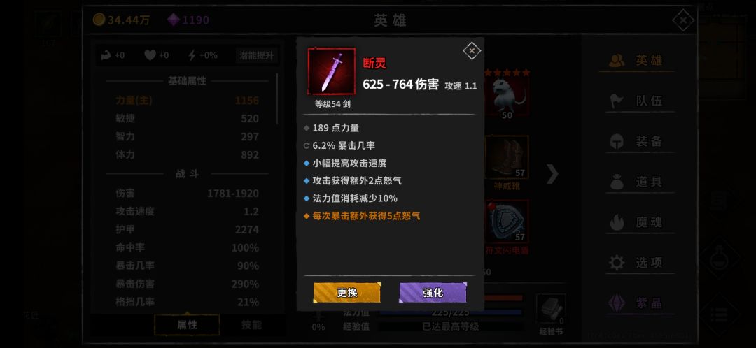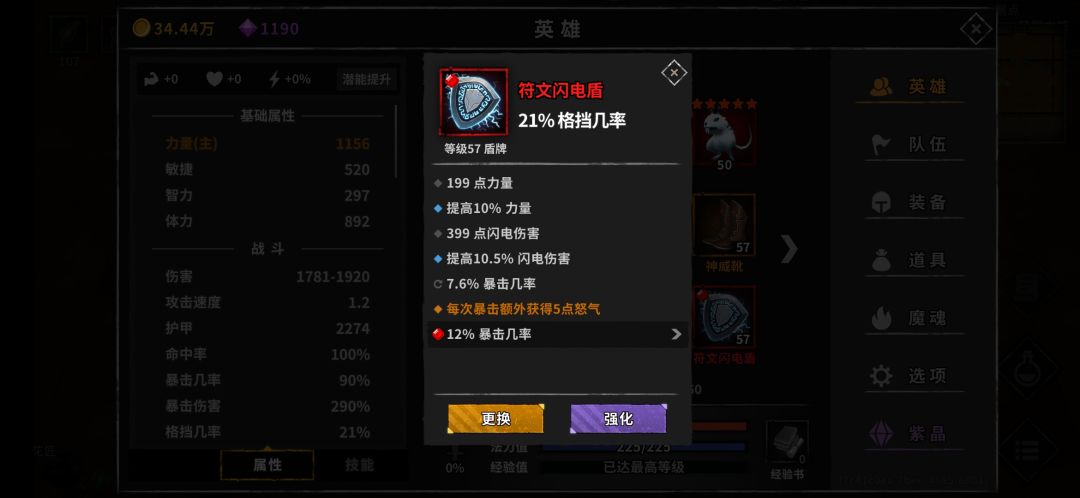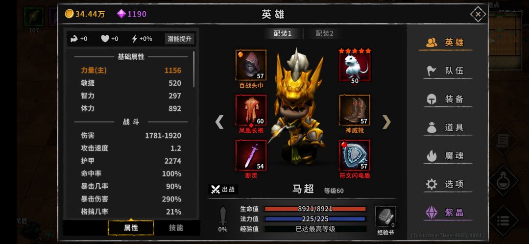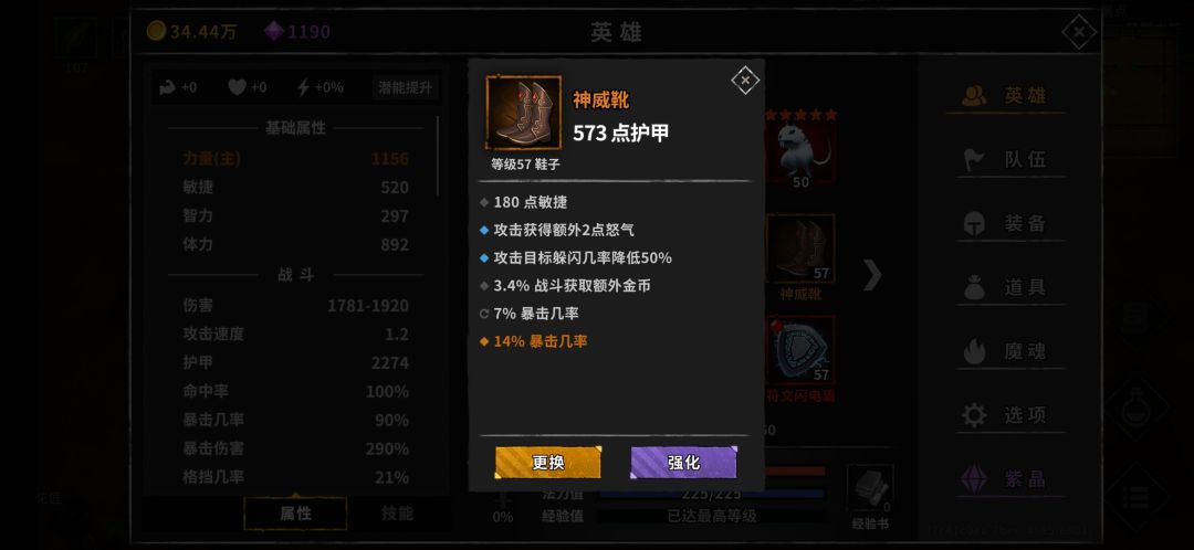 装备:衣服鞋子头,用攻击回怒2+暴击+两条攻击防闪(这个也是重点),橙色词条暴击14。武器,攻击回怒+速度+暴击,副手,暴击+金币(盾无攻击回怒),橙色词条都是暴击回5怒。因为不知道什么原因,满暴击只能怼到90,不然武器也能打14暴击。速度1.2