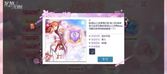 7月15日~7月21日期间,80级以上的小伙伴每日18:30~23:59期间首次参与80级以上世界事件可额外获得一件本等级段适用的高品质装备,有极高几率生成紫色龙语、橙色龙语,更有概率获得金色极品龙语!每日一次,所有世界事件共同记次!