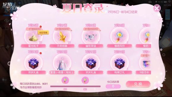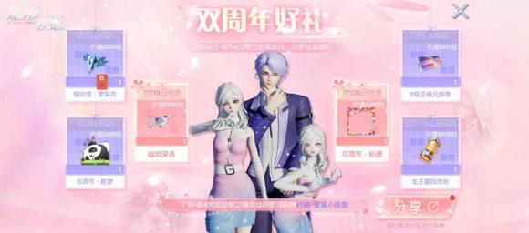 每日登录及达到指定活跃度,即可领取唯美时装·繁星小夜曲(限时)、永久项链·幽玫深语、双周年专属头像框·粉愿、金色龙裔技能、龙裔基因序列、天命结晶、龙威铸铁、樱愿风铃等好礼~