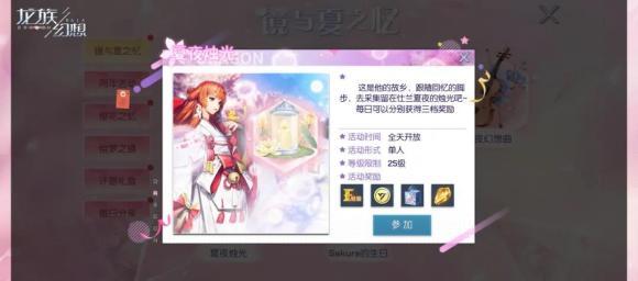 一起去仕兰吧,收集夏夜里的烛光。完成副本即可获得大量经验/金币、萤火之夏礼盒、龙文祭符奖励,收集全部烛光的优秀参与者不仅能获得更多奖励,还可以在夏夜烛光榜中占据一席哦!