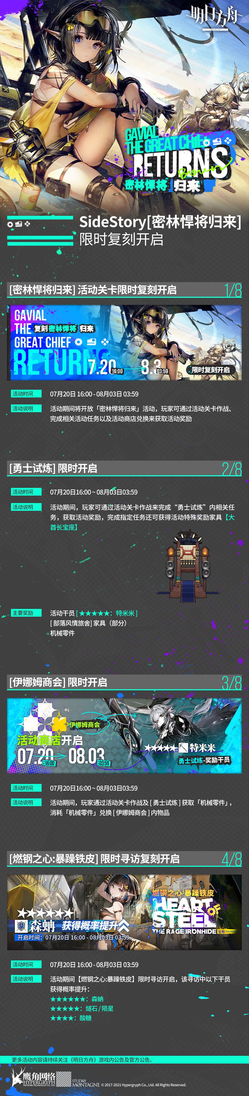 活动详情内容可通过官网或游戏内公告查看,更多活动内容请持续关注《明日方舟》游戏内公告及官方公告。