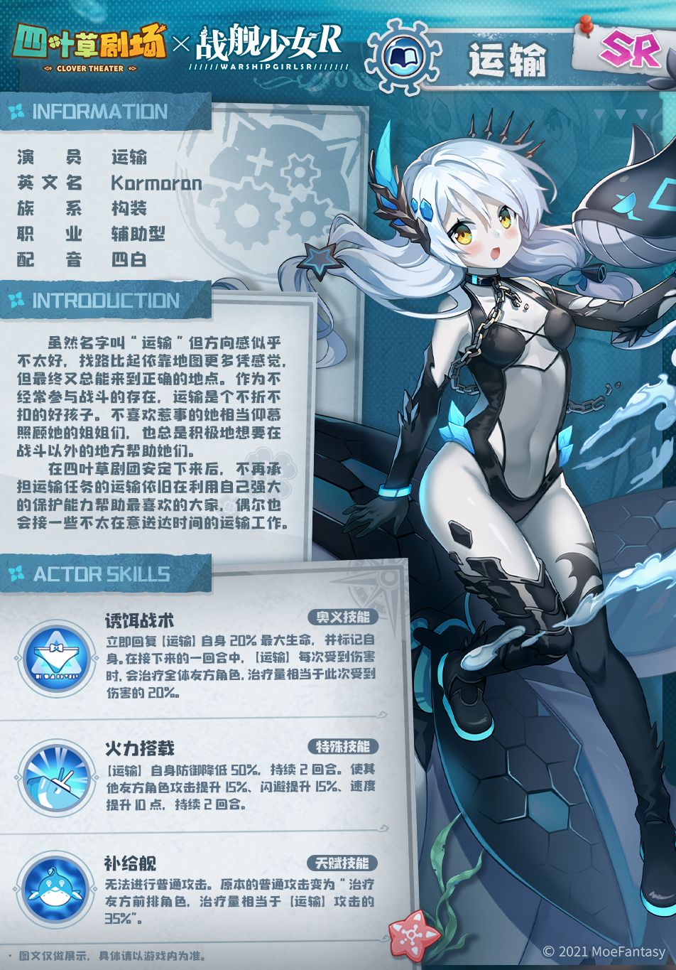 虽然名字叫“运输”但方向感似乎不太好,找路比起依靠地图更多凭感觉,但最终又总能来到正确的地点。作为不经常参与战斗的存在,运输是个不折不扣的好孩子。不喜欢惹事的她相当仰慕照顾她的姐姐们,也总是积极地想要在战斗以外的地方帮助她们。