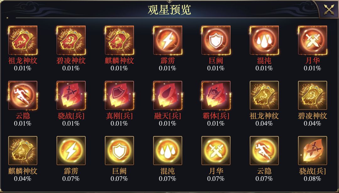 星纹类型分为九种:霹雳、巨阙、混沌、月华、云隐、骁战[兵]、真刚[兵]、融天[兵]、霸体[兵]。<红色>