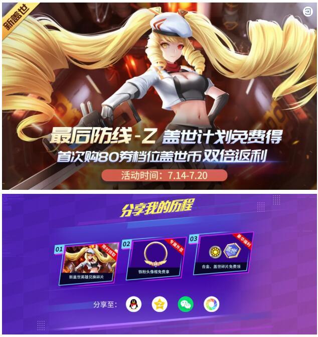 1. 新盖世免费得:全新盖世英雄最后防线·Z 上线,7.14-8.10可通过盖世计划免费获得;7.14-7.20,首次购买80券档位盖世币享双倍返利,共可获得160个盖世币;
