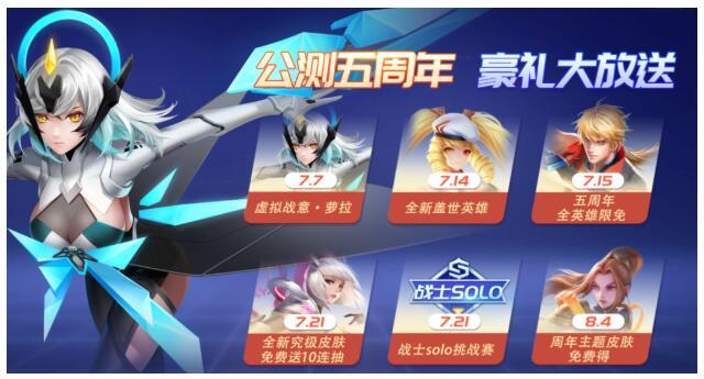 7月15日,全英雄限时限免(最后防线·Z、八神、百合除外);当日登录及世界聊天可免费得周年庆礼包,有机会抽传说、梦幻皮肤