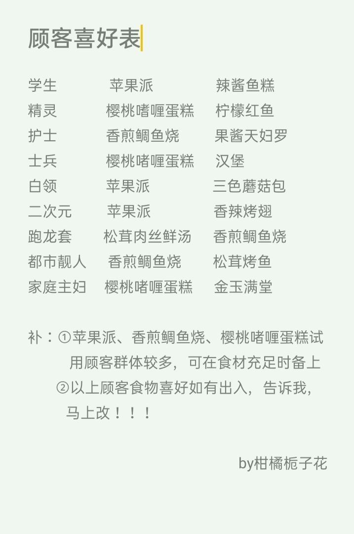 选择顾客喜爱的食物可以得到更多的小费,顾客爱好表来源于叶秋大佬总结的详细封测时的攻略,我自己做了一定更改和新增(见顶图)