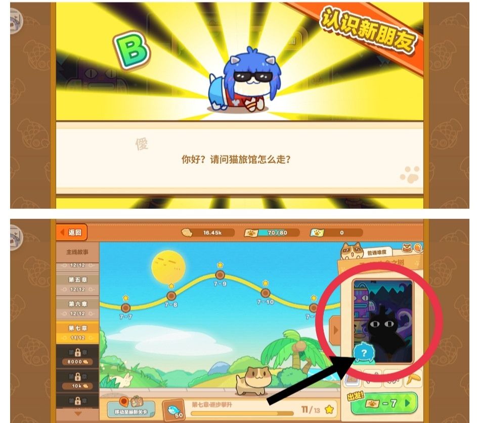 ⑦集齐线索解锁猫咪,需要重复刷掉线索的那关,当此关卡进度达100%时即可解锁猫咪,以及拿到此章节满星