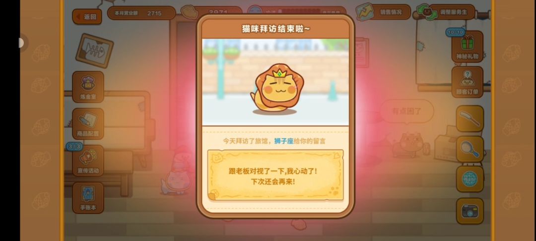 一、活动/抽猫/邀请码都得完成第一章后才会出现,而解锁的前提是旅馆三级,所以当我们打完1-11后,得先去买家具升级旅馆(ps:不要乱用小鱼干,每开一个新的章节需要小鱼干以及升级旅馆也需要小鱼干买家具)