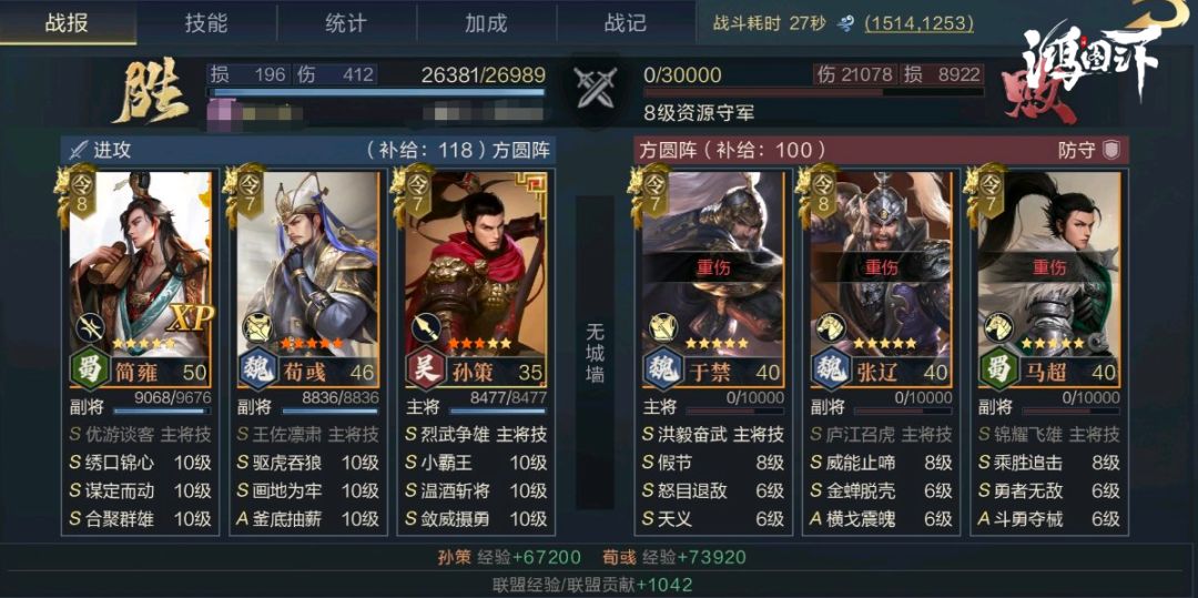 核弹孙策在S4早期便被研发出来,后续经过数次改动出现了多种配置,简雍属于固定位置,而荀彧经过加强后,是目前内战环境中较适合这套队伍的副将,根据不同的情况可更换为木鹿或张辽。虽然是单核路线,但孙策拥有不错的自我续航能力,自带的破甲与温酒叠加后,敛威慑勇配合画地、空城计、釜底抽薪等技能爆发非常出色。