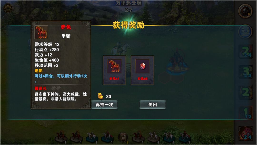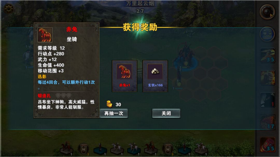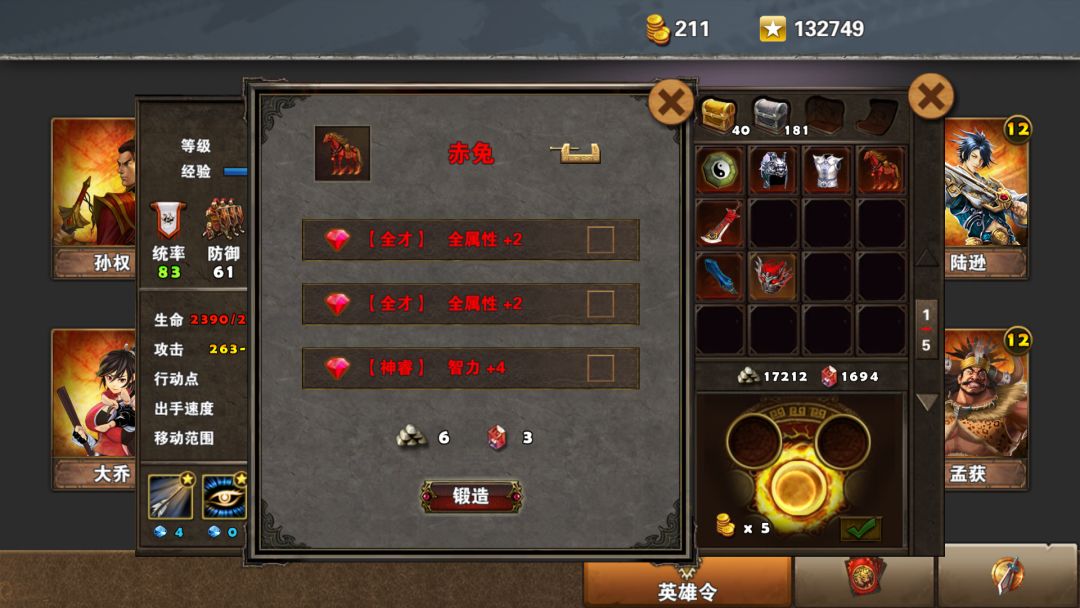 昨天还两次免费出了一个二孔一个三孔,运气爆炸,第一时间把原来三个一孔赤兔分解了。然后随手锻造了几下,就出了双全加四。这是玩一年的运气都集中在一天爆发了。。
