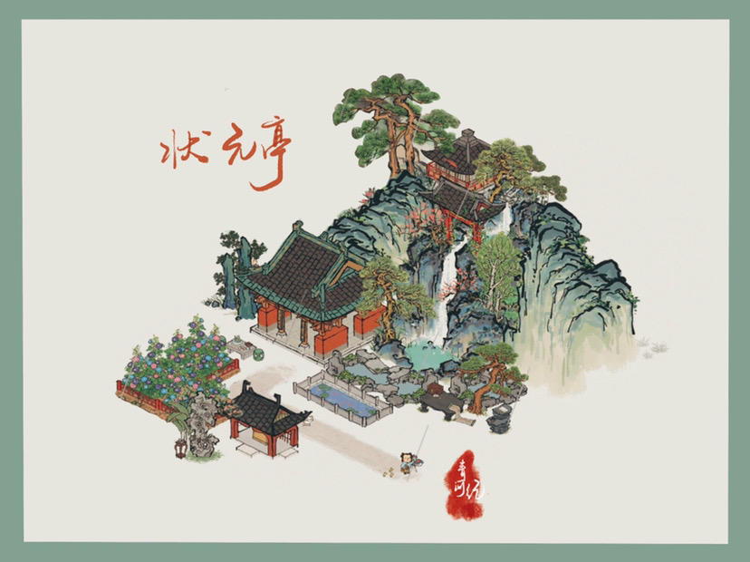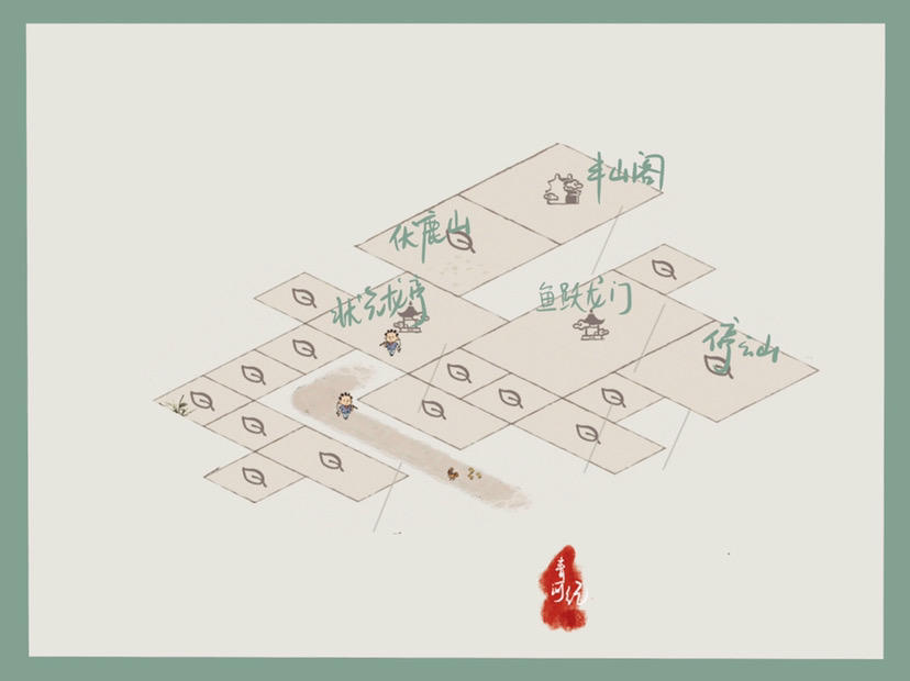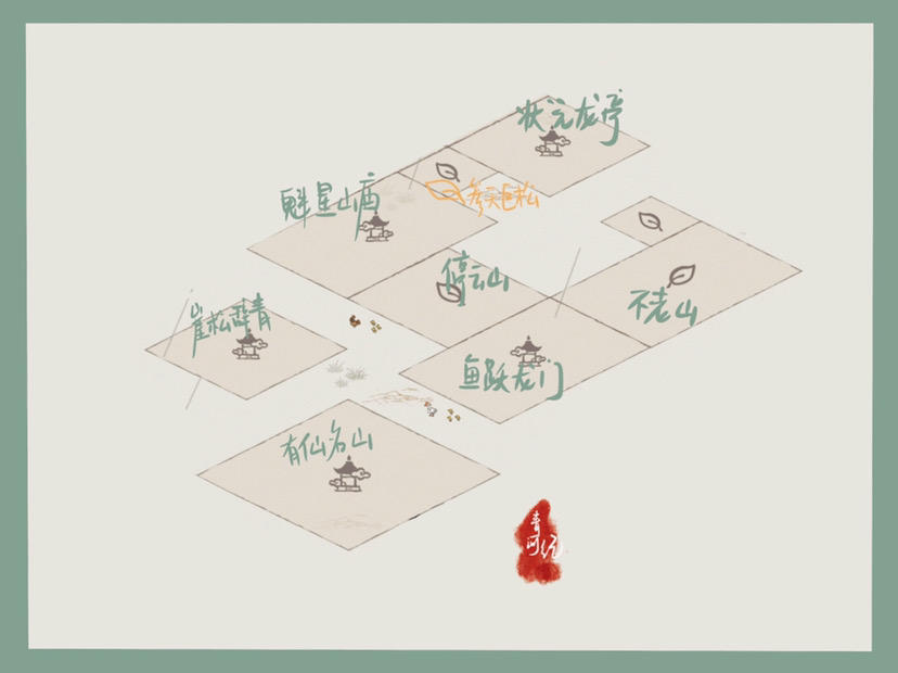 山势布局重要的是借位,魁星山庙的小路就通过借位夹在两山之间,看起来比较有趣味。以及想营造出一种多层瀑布叠加的感觉