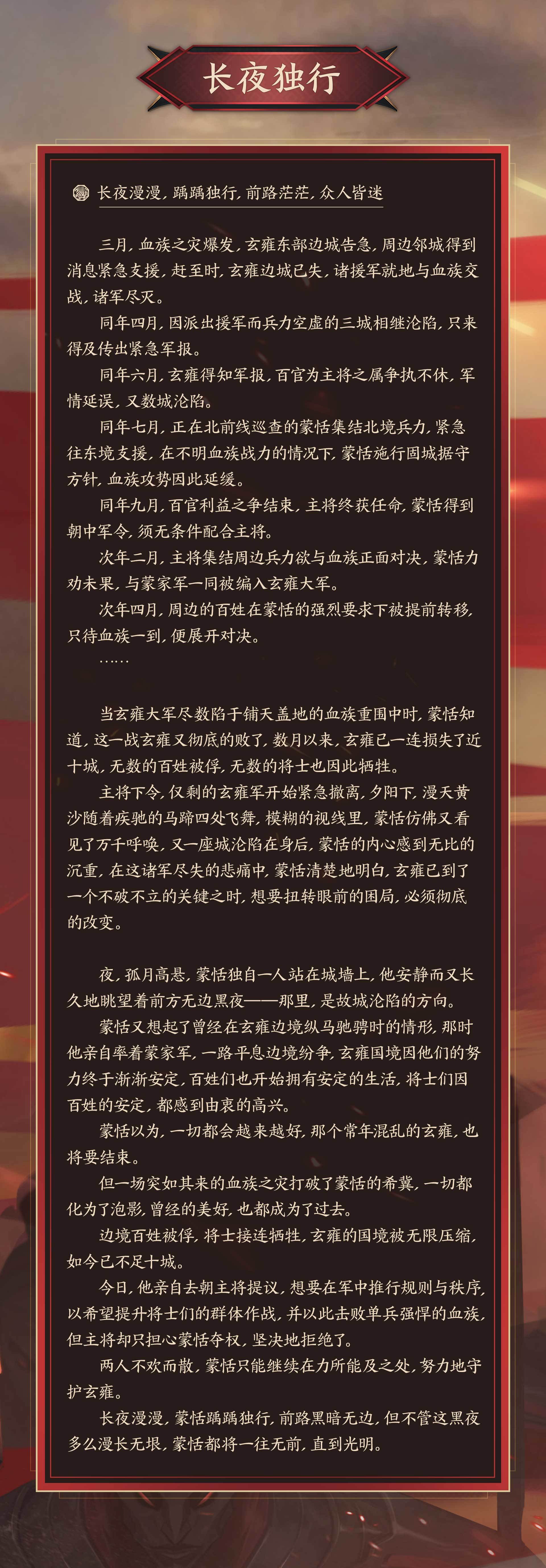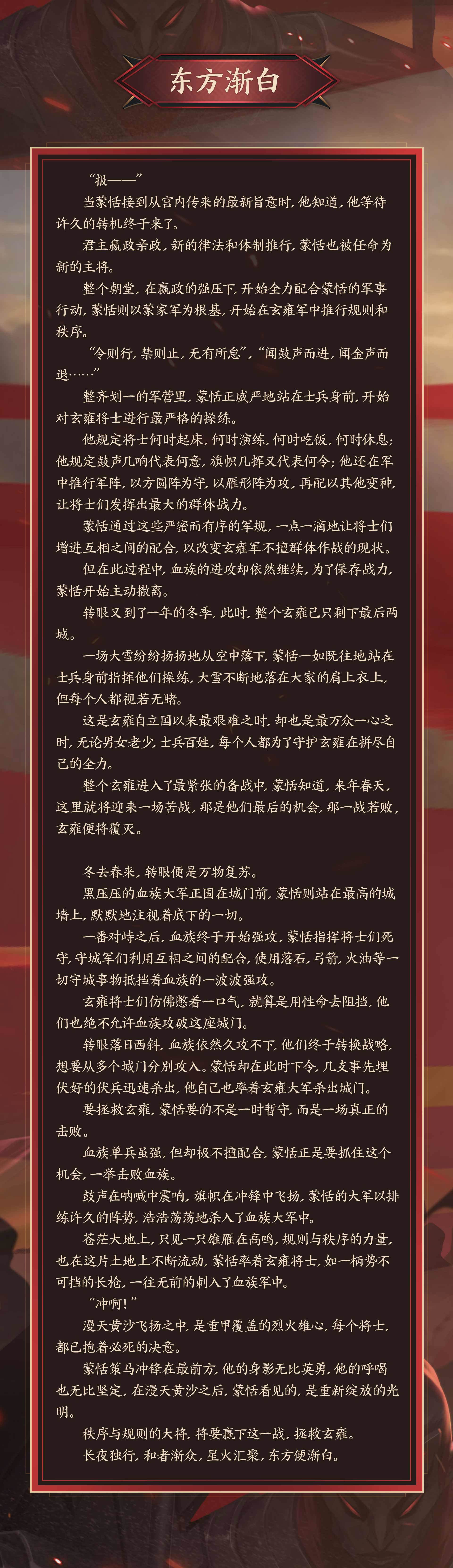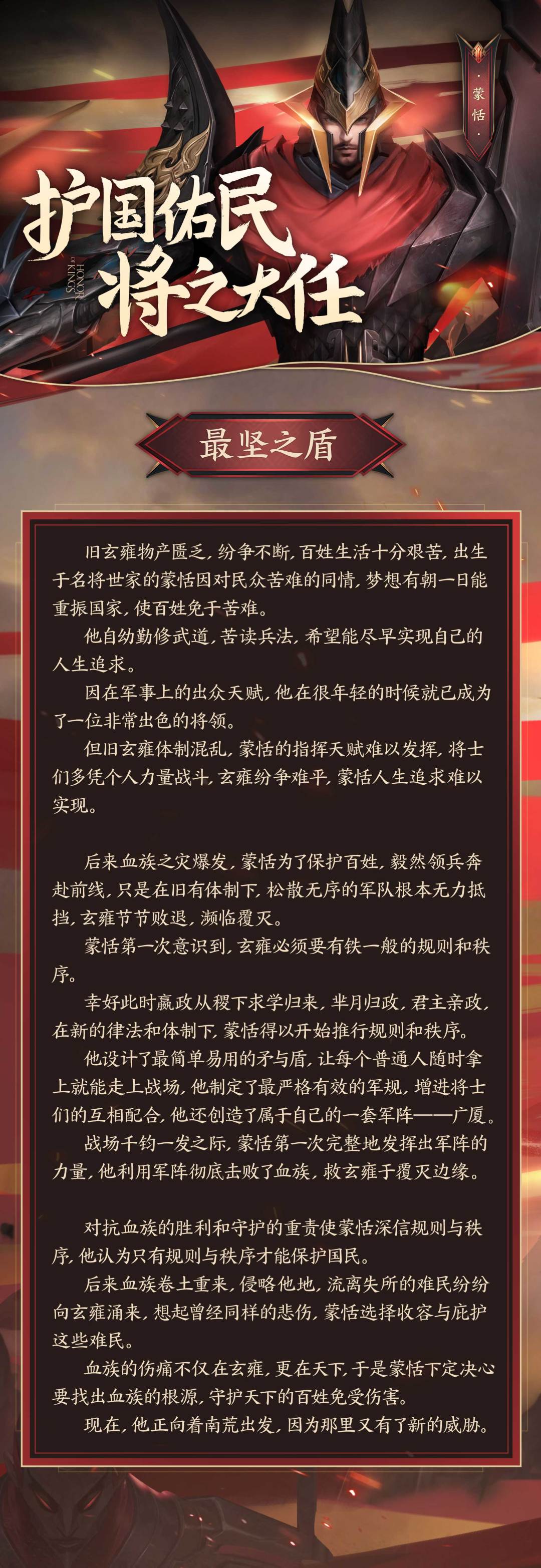秩序与规则一直都是蒙恬的代名词。新君上任之后蒙恬更是将这两则信条运用到了战场中,发挥军阵的力量,力战血族,救玄雍于覆灭边缘!成为玄雍值得尊敬的大将军!