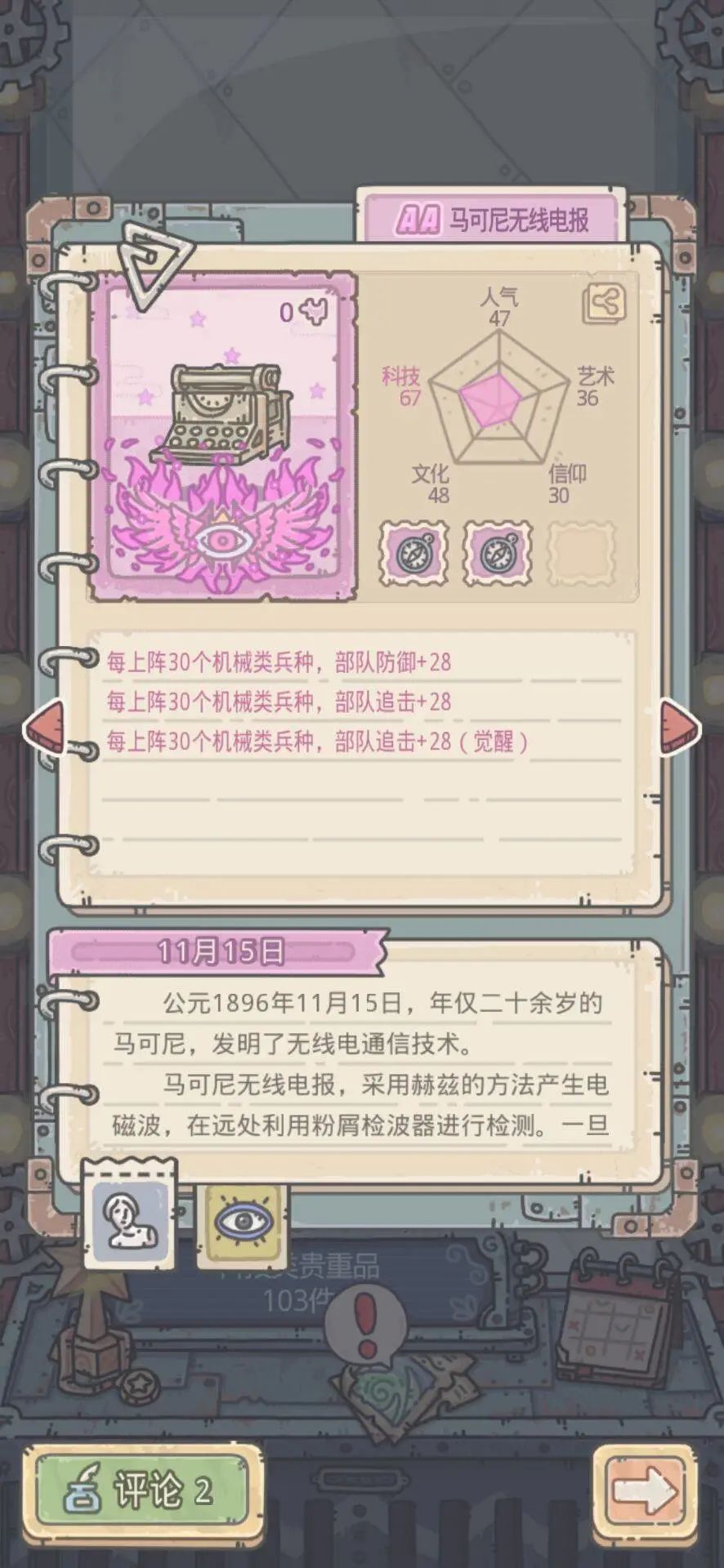 中间格研究获得马可尼无线电报碎片,共计3次,分别获得20/20/40碎片,觉醒后贵重属性为每上阵30个机械兵种部队防御+28,部队追击+56。技能为: