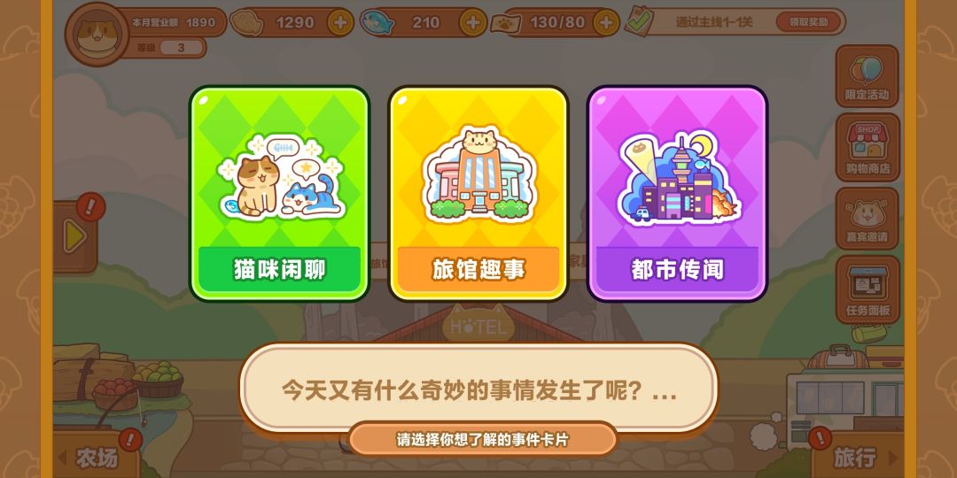 赚来的猫币要怎么使用这也会影响猫旅馆后续的发展,刚起步建议先把猫币用在开商品升旅馆等级和推图上,开商品是为了每个客人的喜欢都能兼顾到,旅馆等级可以提高小费收入,推图是为了各种素材,建设农场和旅馆都需要。