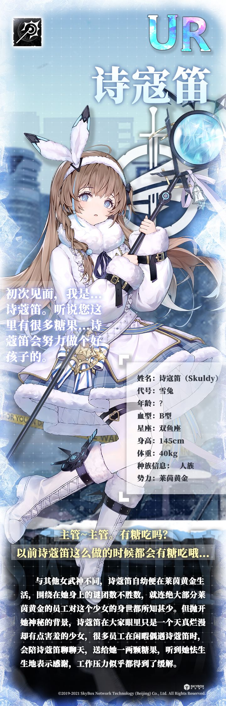 诗蔻笛自幼便在莱茵黄金生活,对于她的身世,绝大部分莱茵黄金的员工并不清楚,就连她自己都不甚明了。