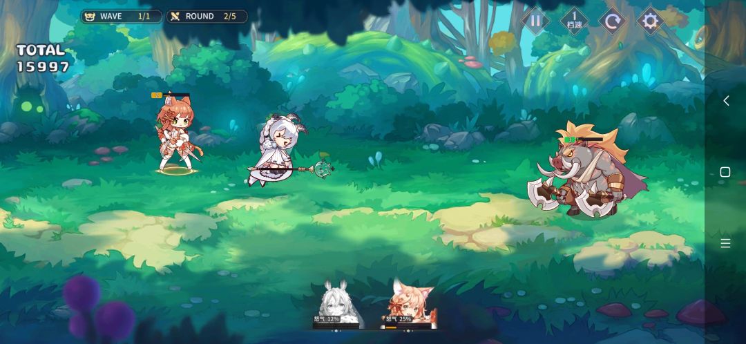 阵容如图,建议手动操作。在第二回合时,先使用猫的技能(手一定要快,不然容易错过),在伤害上可以干掉鳄鱼(应该是吧),然后注意诺埃尔技能——敌人越少伤害越高。在猫放完技能时立马预约好诺埃尔技能,最后猫残血收割。战斗结束。