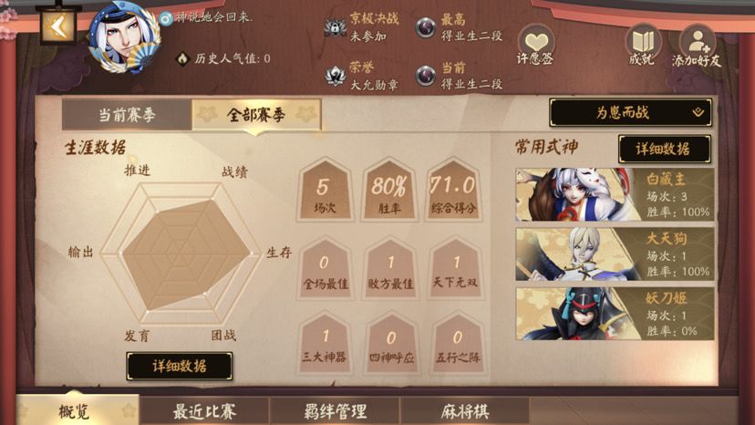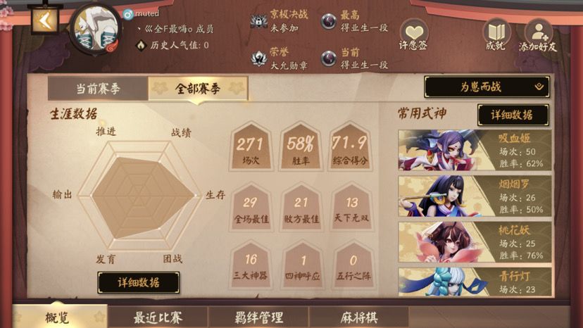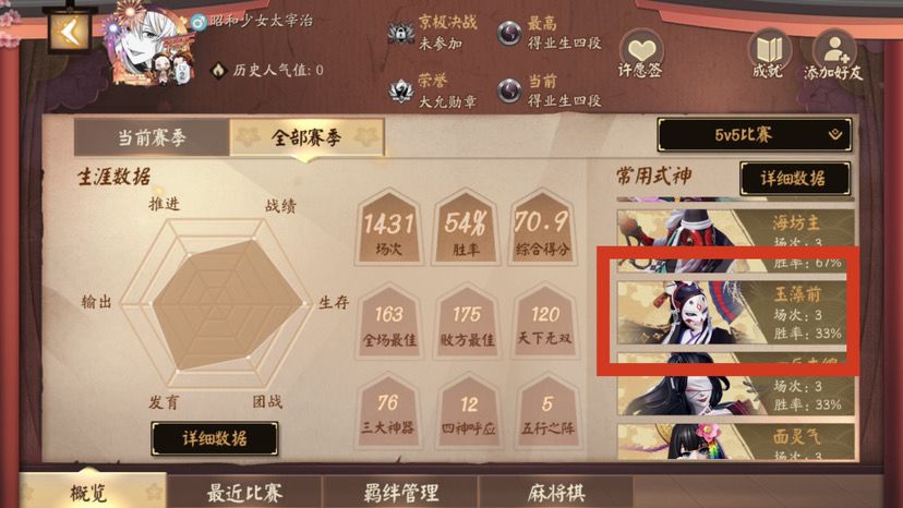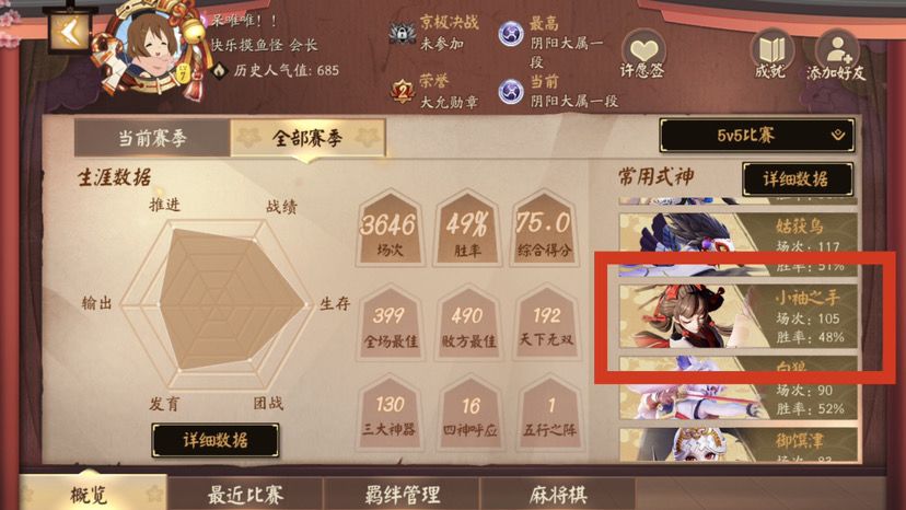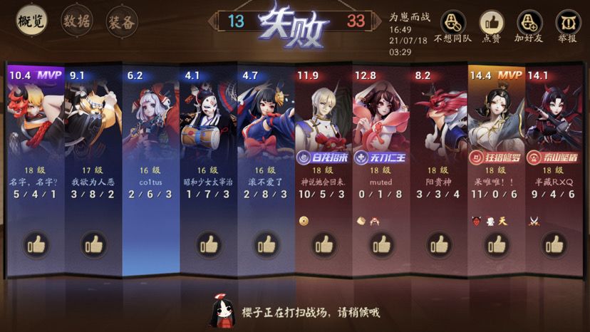 我真是犯贱又无聊最近活动准备玩几局,开了一把为崽而战,奇葩匹配我们这边没一个会玩,特别是玉藻前,大技能往塔下一直没丢中过一个人,对面打野小袖之手carry全场,中路大天狗把我们红叶打成狗,上路也崩,下路一个桃花妖把我和玉藻前压着打,我第一次玩百目鬼想练练,只在逢魔和狭间玩过几局只能算不拉垮不会无脑送的那种,以为第一次玩匹配的也是新手,至少每个人都会是初次玩的式神,结果我们这边全员崩,对面各种乱杀,投票三次还不投我真是疯了,这游戏体验真是服,出来一看数据,玉藻前玩了1000+就这意识基本水平都不达标,对面小袖之手却玩了一百多局总局数3000+,主要是玉藻前这才玩了几局这式神,对面小袖之手玩了几局?这也能旗鼓相当匹配到?