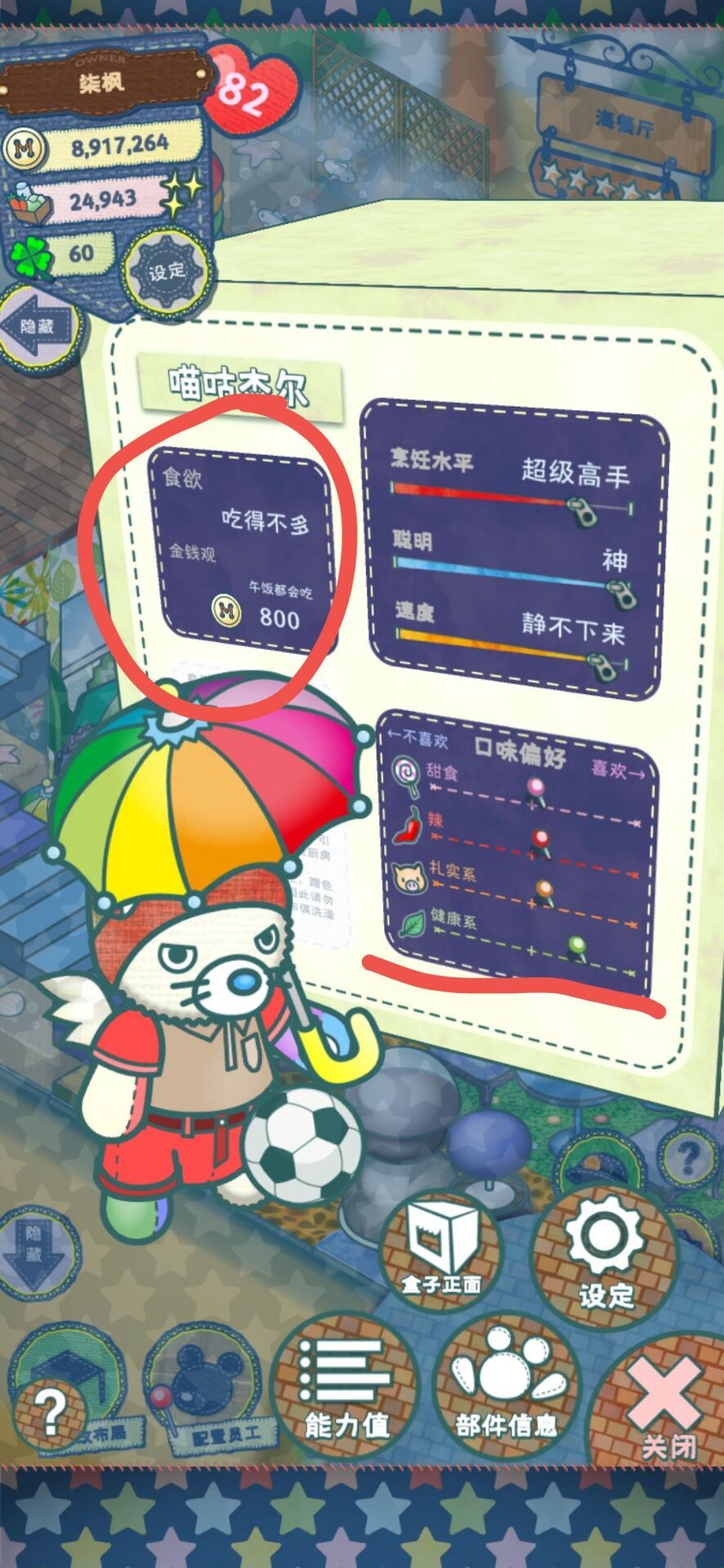 首先,金钱观、食欲、某个口味突出最重要!(金钱观>口味>食欲)因为这三个属性是固定的,而右上方的三个属性也很重要,但可以通过兼职提升。如图: