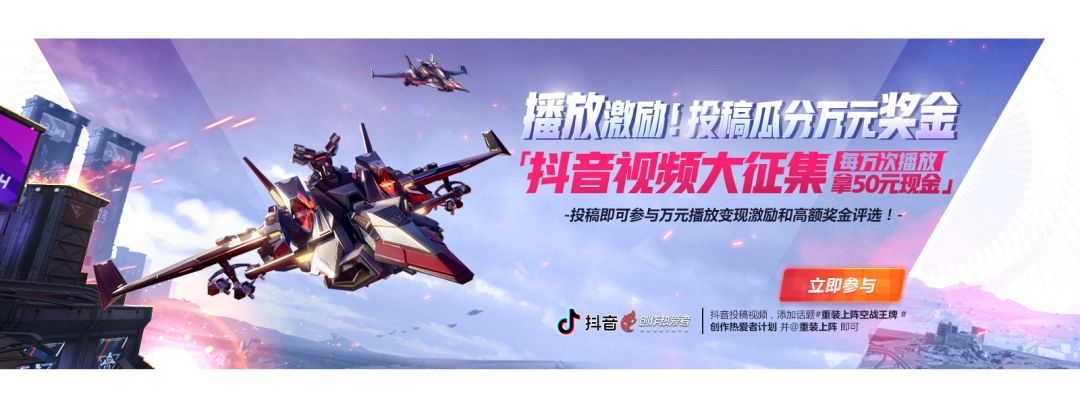 在 抖音 发布《重装上阵》游戏相关视频内容,在视频发布时添加话题 #重装上阵空战王牌 和 #创作热爱者计划 并@重装上阵,即可成功参与!作品链接需提交至创作热爱者APP“重装上阵抖音激励活动”页面。