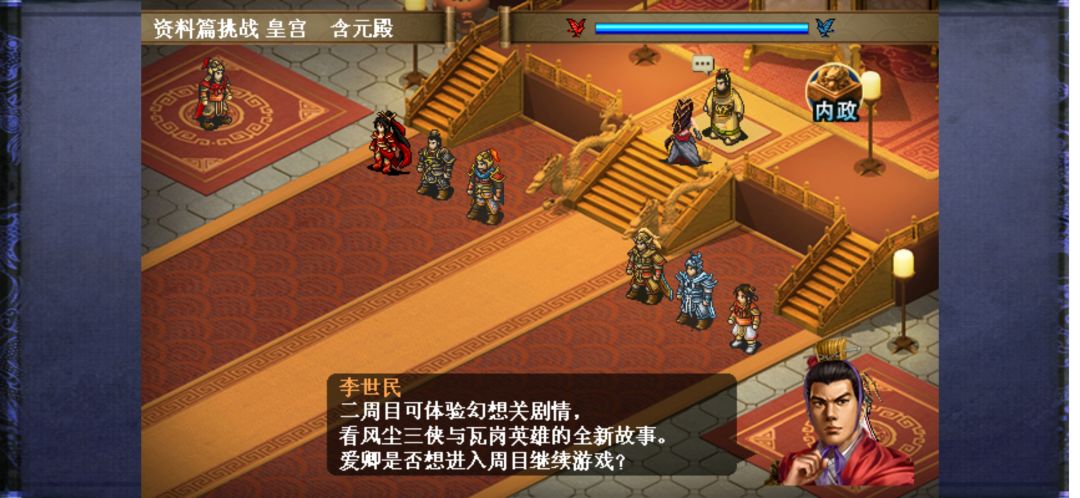 最轻松的一关,上面四人加可控友军开唐四將和杨林宇文成都,这关体验超级猛将,不过不要浪费回合,尽快结束