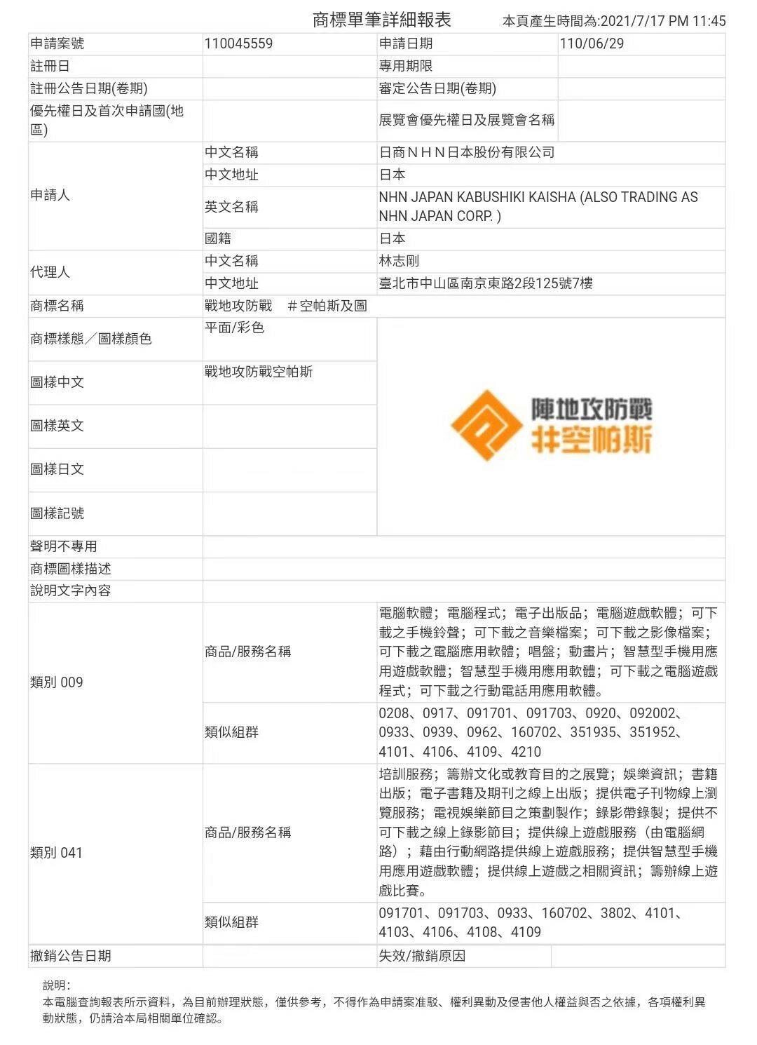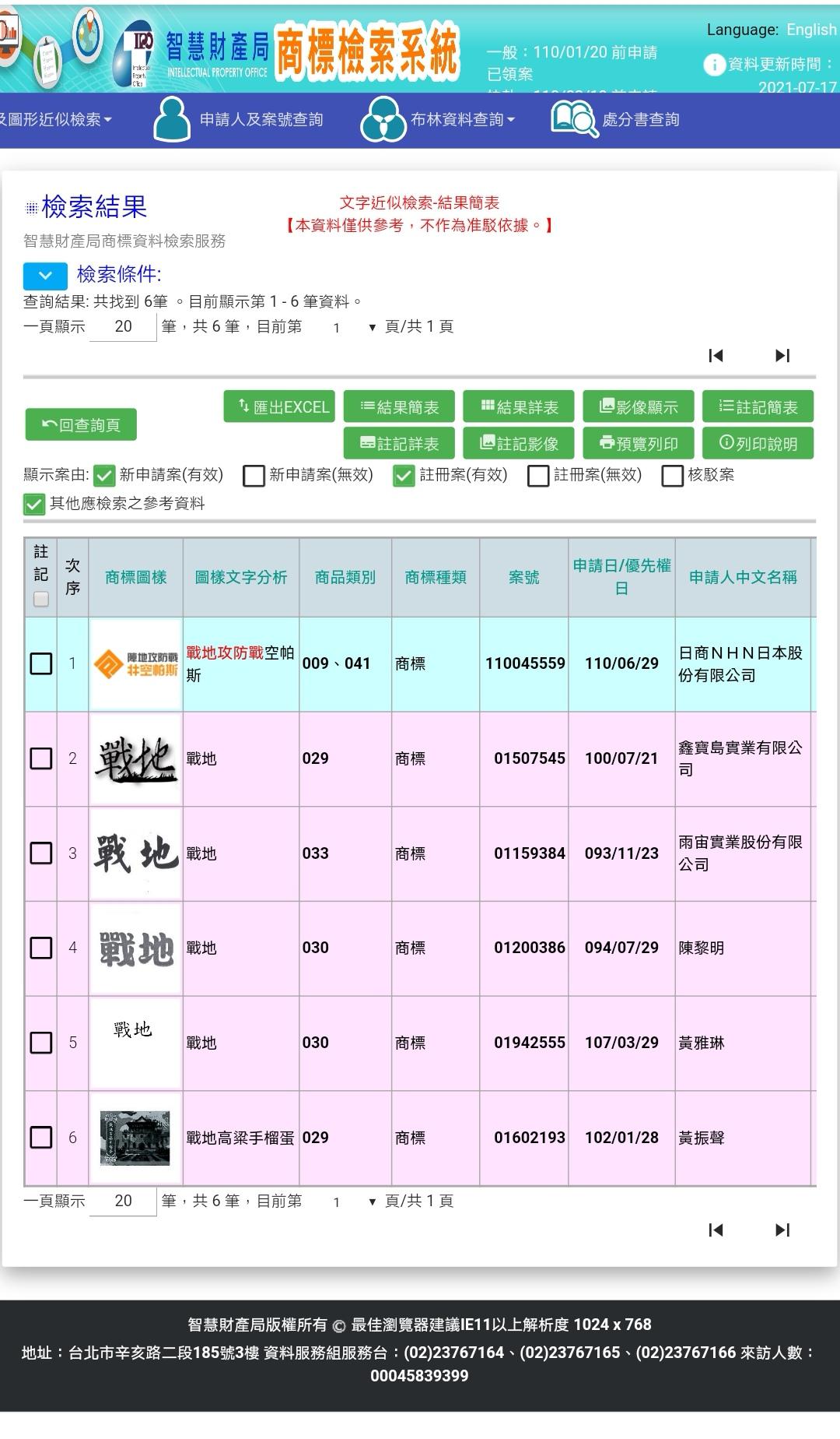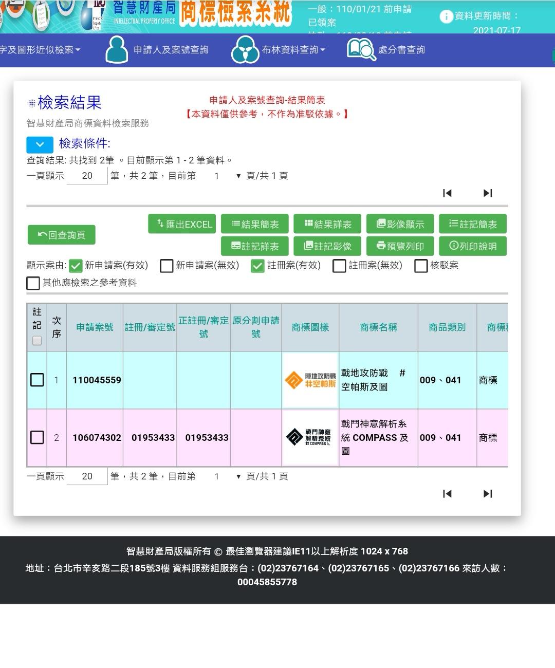 然後如果搜公司名的話,就可以看到一個是三年前申請的康帕斯台服商標,一個是今年六月底申請的奇奇怪怪的東西
