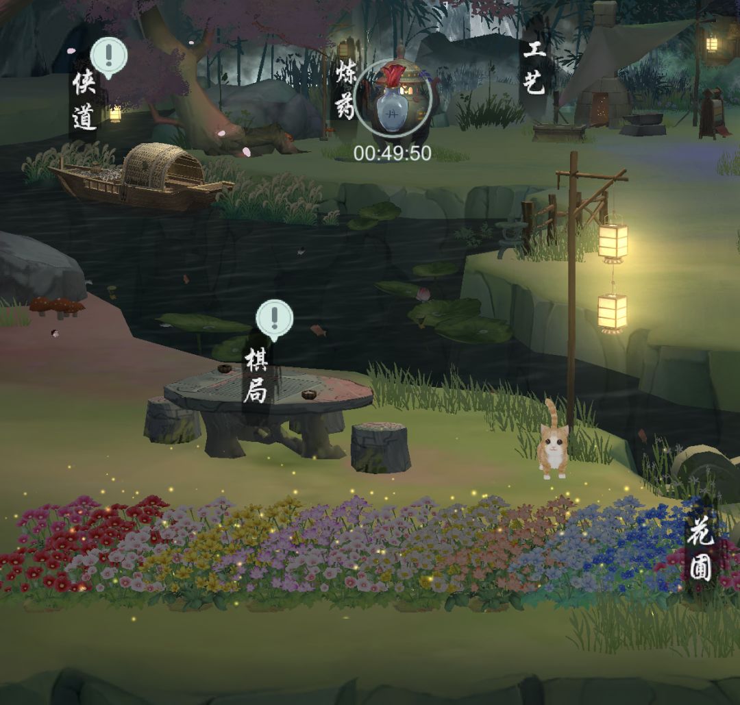 想法有一周了,今天花园终于开花了,犹豫种子不是很好获取,我只能种一行来截图了,夜间光线不好,花朵颜色不太好分辨。