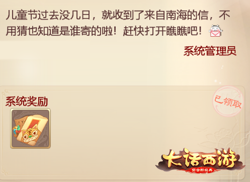 活动结束后,完成7个地区的“心满意足”的侠士将会收到从南海寄来的一封神秘的感谢信,里头有红孩儿送给大家的谢礼,至于礼物是什么内容,就等到时大家亲自揭开谜底吧!