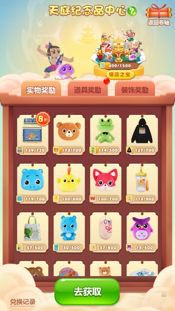 开启宝箱可获得实物周边及道具奖励碎片,集齐碎片便能获得对应奖励啦~