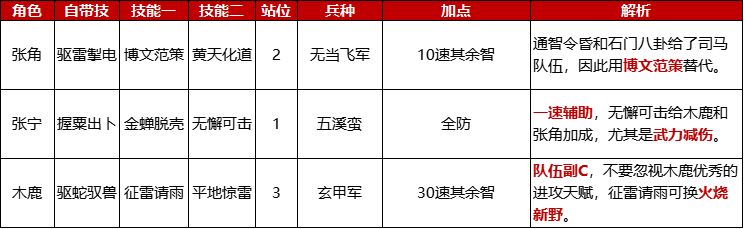 因为火烧新野极其优秀稳定,附加的神算暴击完美符合木鹿的进攻天赋(触发神算恢复15%的兵力)并且自身附带增伤,加上神算的话张角队输出更优秀。