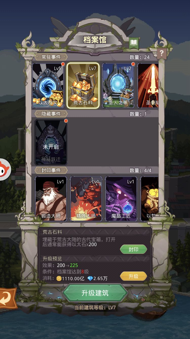 这时候就可以切到你的打金图,点开聊天频道度过这激动又空虚的10分钟,然后切回二陆继续升金币塔,缺金币就金药一个一个吃,吃一个回去点一下。以太差不多用完了,在档案馆开启以太石料事件,跟着档案馆等级升。