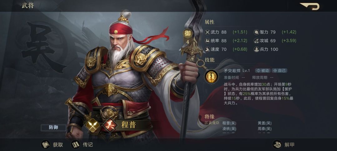 第三个登场的是程普。同样作为前排,不同于吕蒙靠闪避来躲避伤害,程普主要靠统率来进行扛伤。技能不但提高自身统率还可以为兵力比最低的友军部队施加援护状态,有一定概率为其承担所有伤害且回复自身一定比例的最大兵力。